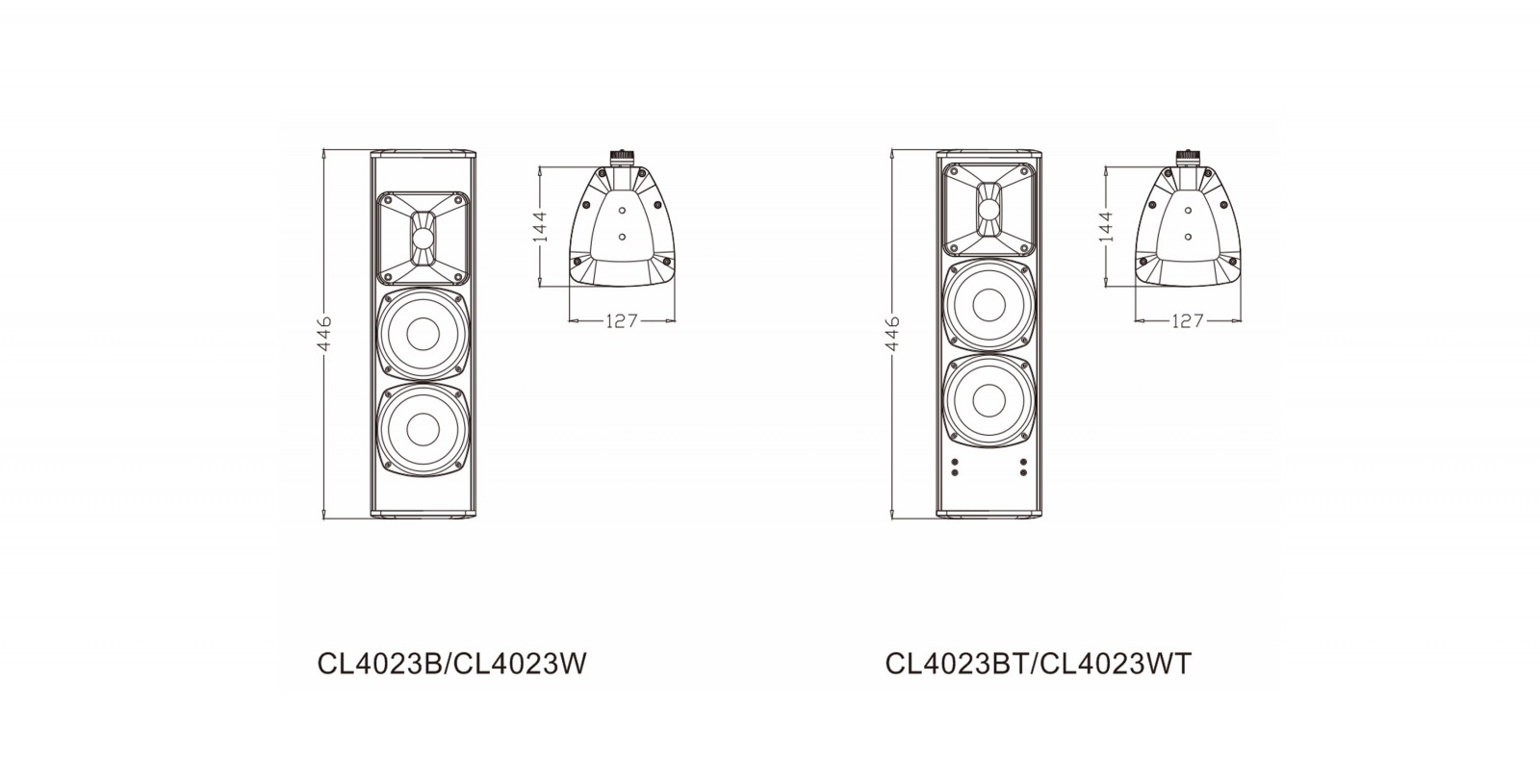 The CL4023 series is a 4”, two-way,all-weather column speaker with different colours or functions, with waterproof, dustproof, windproof, anti-uv aging, dustproof and waterproof covers specially designed for input and output, and multi-layer different functional grille. The product meets the IP56 standard. The exposed metal parts are sprayed with stainless steel or aluminum, and the mounting bracket is sprayed with low-carbon steel to meet all-weather use. The sound is soft and balanced. Unit configuration: 2x4" 25mm voice coil ferrite mid-bass units, 1x1" exit throat 34mm HF driver with horn, the cabinet is made of aluminum alloy, and the upper and lower panels of the cabinet are die-cast. The B and W after the model represent black, T represents the configuration of transformer and band switch to achieve a variety of different output powers including constant resistance.