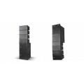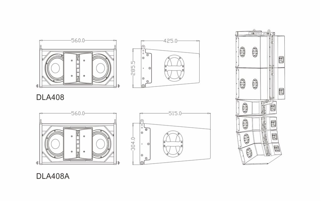 DLA408 is a small-sized, light weight, high SPL, 3-way line array speaker. It features low distortion mid-bass unit, mid-high coaxial driver with special waveguide and horn, accurate coverage, uniform changes, three-point hanging system, the whole system installation is fast, stable and safe. Unit configuration:2x8" high efficiency neodymium mid-bass units, 1x1.4" exit throat 90mm voice coil neodymium MF driver and 44mm HF driver coaxial neodymium unit. The cabinet is made of multilayer composite plywood with wear-resistant polyurea paint. DLA408A is an active line array speaker with two channels digital amplifier with DSP.