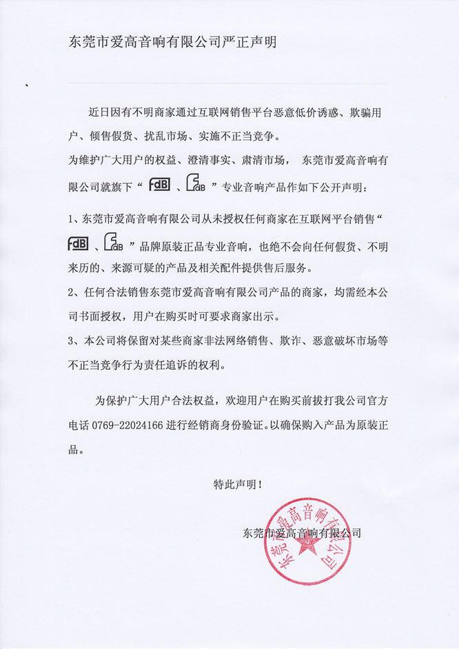 Recently, some unknown merchants have used Internet sales platforms to maliciously lure users with low prices, deceive users, sell fake goods, disrupt the market, and engage in unfair competition. In order to safeguard the rights and interests of users, clarify facts and clear the market, Dongguan Aigao Audio Co., Ltd. makes the following public statement on its "fdB" professional audio products: