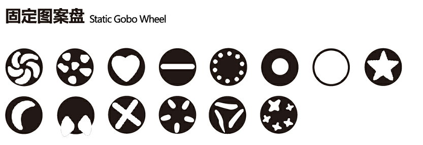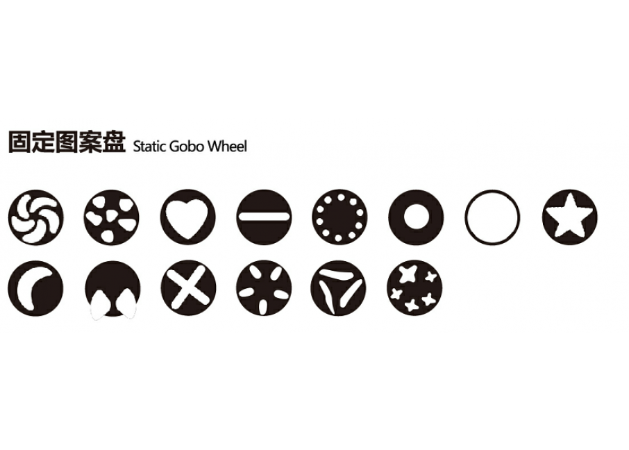 ♦ Static Gobo wheel: 13 gobos + open(Including 5 glass gobos),