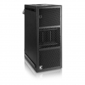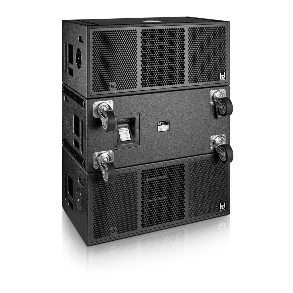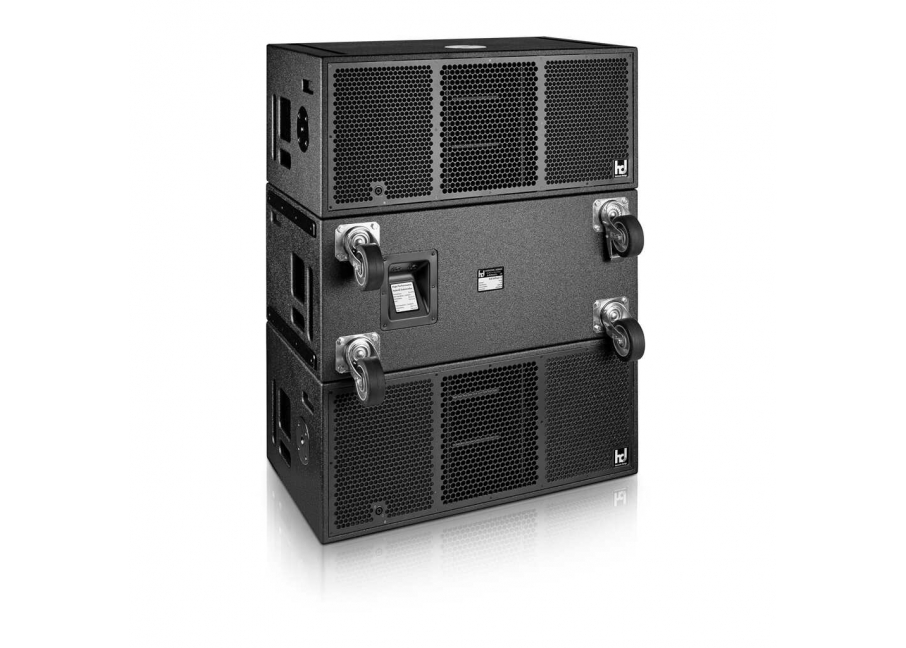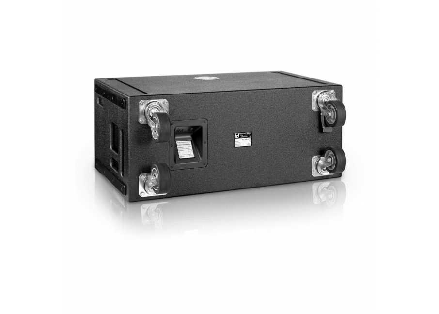 An M20 threaded insert on the top and side of the enclosue allows a distance rod to be inserted. Protective skids made of high-strength PVC on two sides and corresponding recesses on the top of the cabinet ensure a secure footing. The NL4 Speakon jacks, mounted on the back of the recessed connector panel, are used to connect and route the input signal. A Speakon socket in the protective front grille allows cardioid configurations without special interchangeable cables.