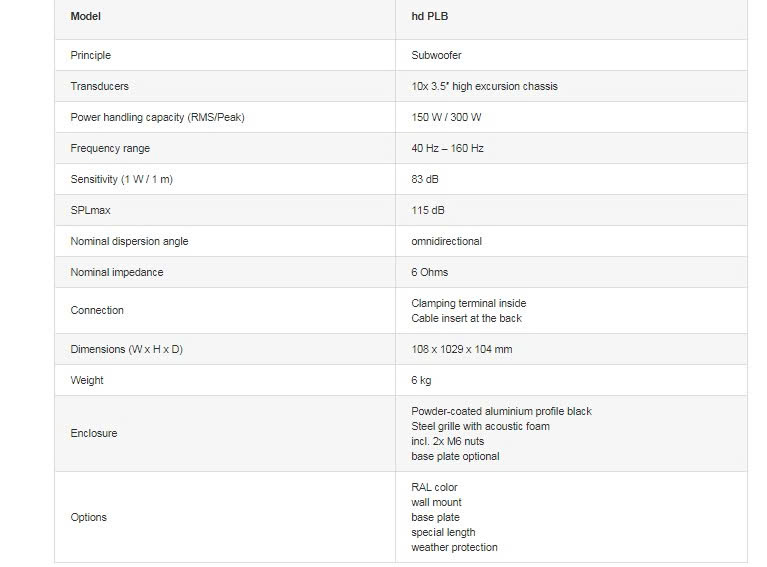 The hd PLB is an extremely compact, array-capable subwoofer in the elegant hd PL-series column loudspeaker design with astonishing bass reproduction for combination with any mid-high loudspeaker for full-range applications. The inconspicuous hd PLB subwoofer element consists of ten powerful 3.5“ high-excursion chassis with a continuous power of 150W RMS. Thanks to the proven single-roll surround technology for a large linear excursion and the best possible impulse fidelity, the 104 x 108 mm slim subwoofer has a frequency range of 40 – 160 Hz (-6 dB) and is therefore ideally suited for invisible applications in restaurants, conference rooms, museums, theaters and churches . The nominal impedance is 6 Ω, so that various sound reinforcement scenarios can be efficiently implemented with the installation amplifiers of the hd Qi series.The hd PLB subwoofer module has the same housing dimensions as the hd CCX- and PL-series and, thanks to MIX & MATCH, e.g. can be combined with an hd C5CX or hd PL16 to form an inconspicuous but dynamic full-range column loudspeaker with a transmission range of 40 – 22,000 Hz. On request, this combination can also be manufactured in a continuous housing.