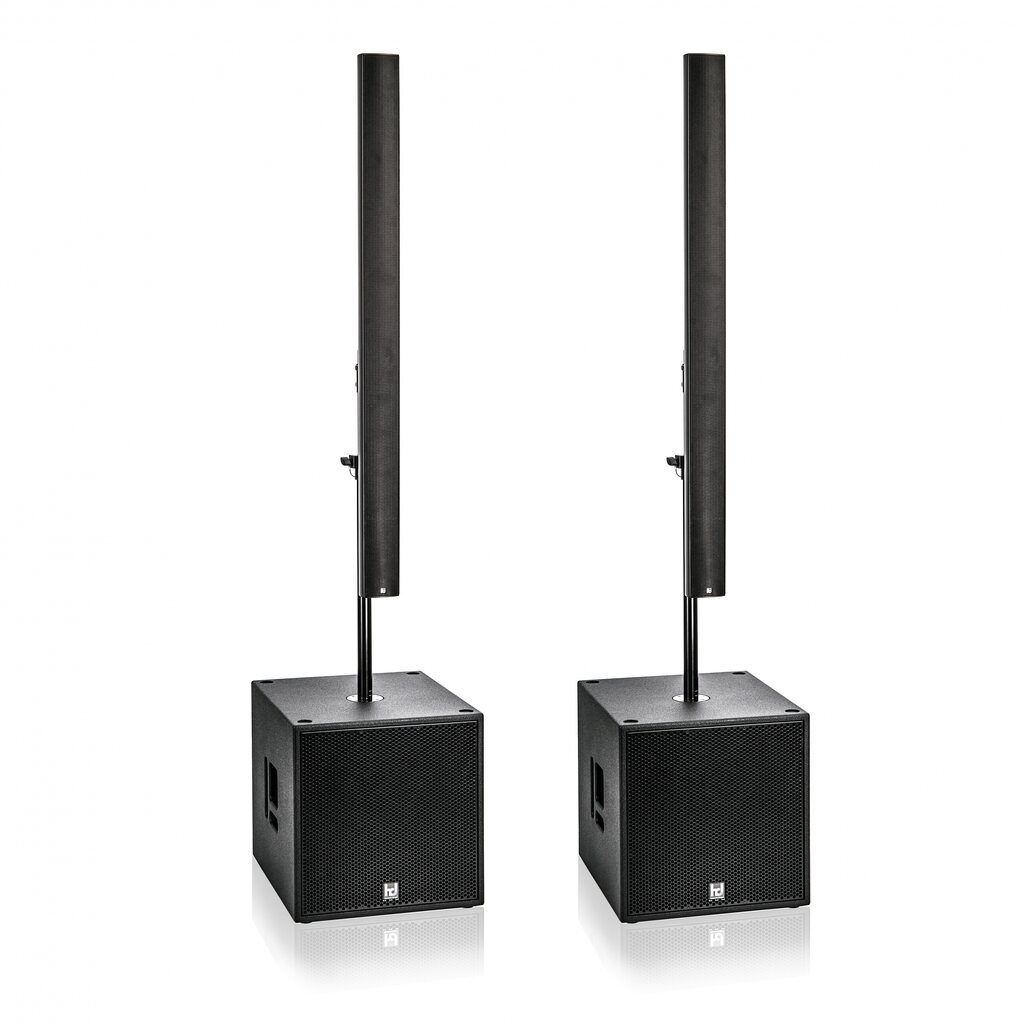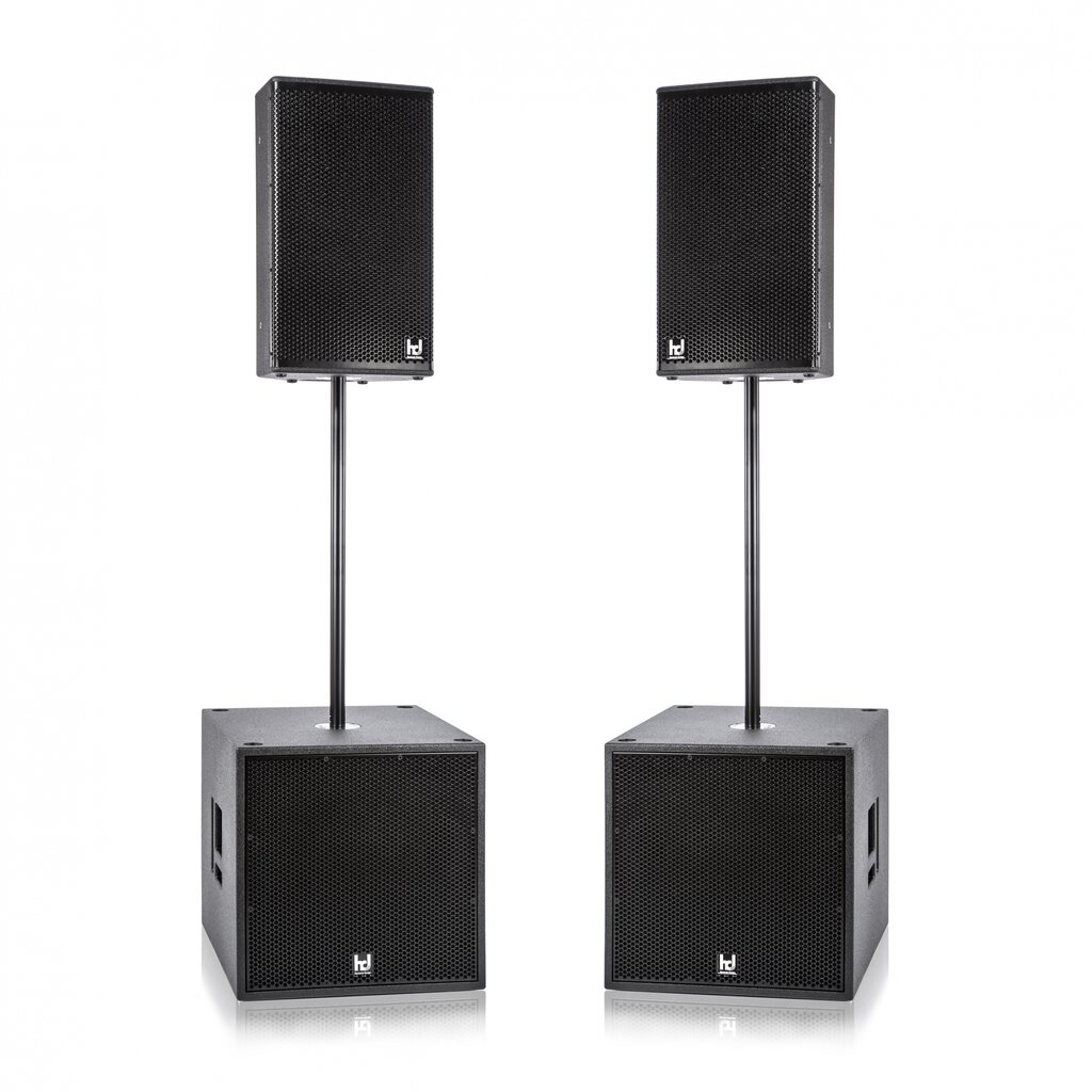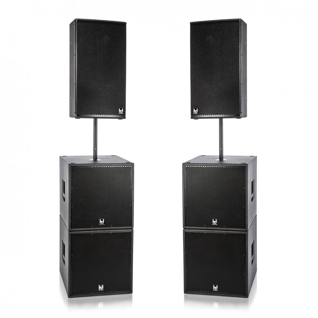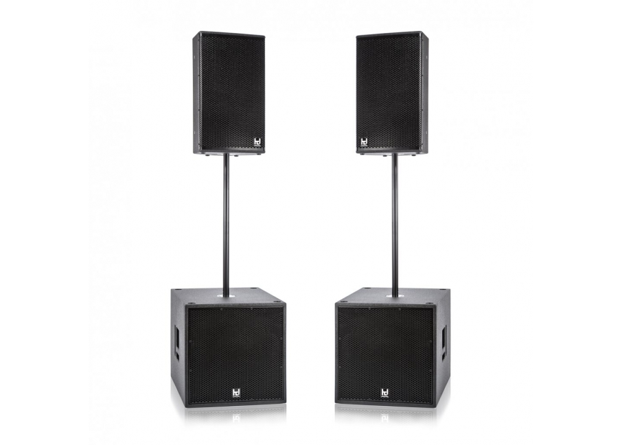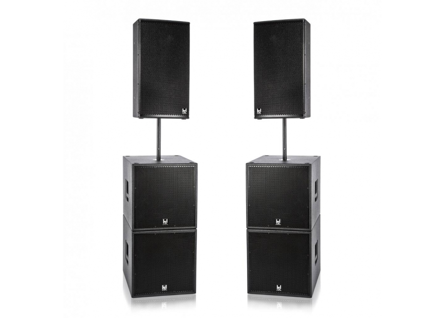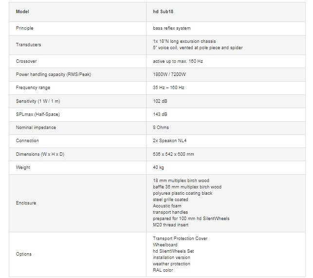 The hd Sub18 is a compact, easy to carry and powerful subwoofer in bass reflex tuning. The specially developed 18″ long excursion chassis with 5″ voice coil on fiberglass carrier and neodymium magnet system allows a linear excursion of 30 mm. Through a ventilation at the pole piece and at the spider the heat development of the coil is optimally dissipated. Therefore, an extremely high continuous power handling capacity of 1800W / 7200W (AES / peak) is possible. The lower heat development also means increased reliability and reduced thermal stress on the voice coil. Excellent dynamics and dry bass reproduction at incredible pressure is the result. The filtering is done by Harmonic Design DSP amplifiers. With active crossover of 24 dB/octave up to max. 160 Hz, best possible transitions between LF and HF are achieved.The enclosure is made of multiplex wood and provided with a shock and weather-resistant polyurethane coating. The front of the speaker is a stable front grille with
