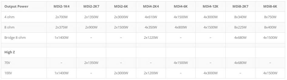 • Optional Dante™ and AES67 (ATMOS and RAVENNA compatible) audio inputs (not available in MDi amps with XLR and Speakon connectors)