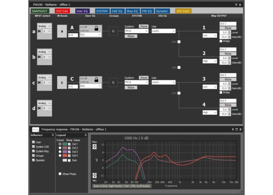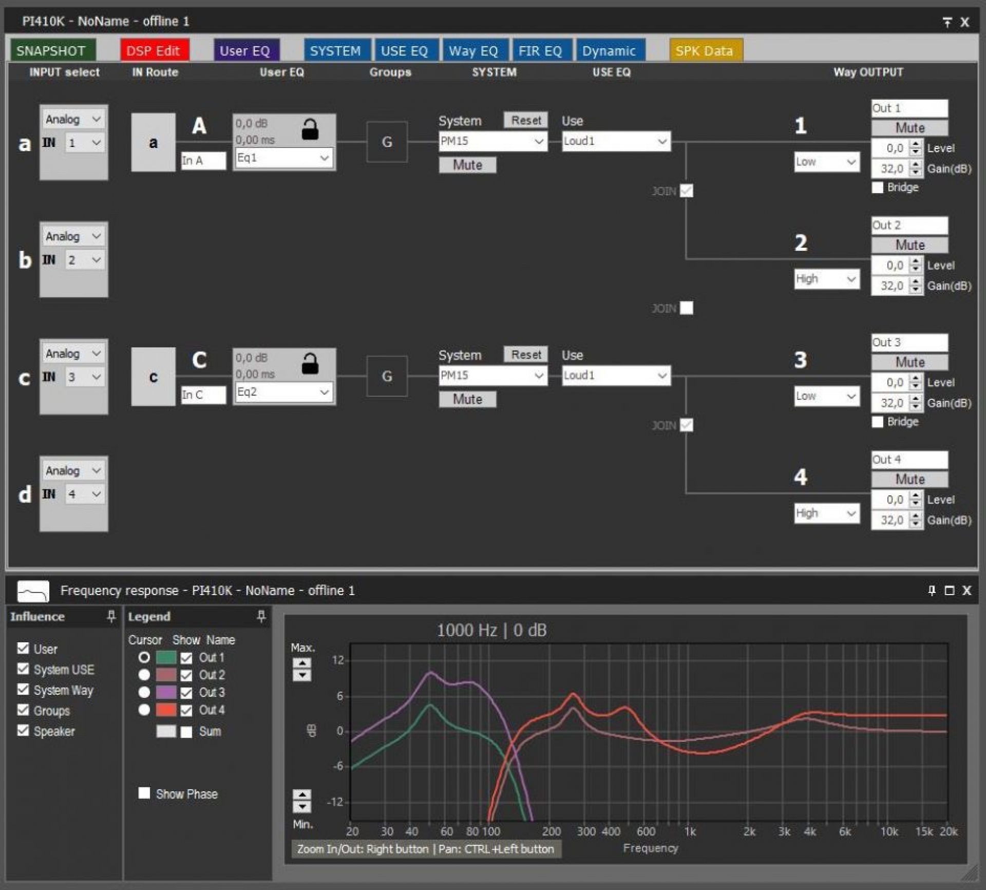 • Output IIR EQ: 12 filters per channel (Parametric, Shelving, LP, HP, BP, SB, AP)