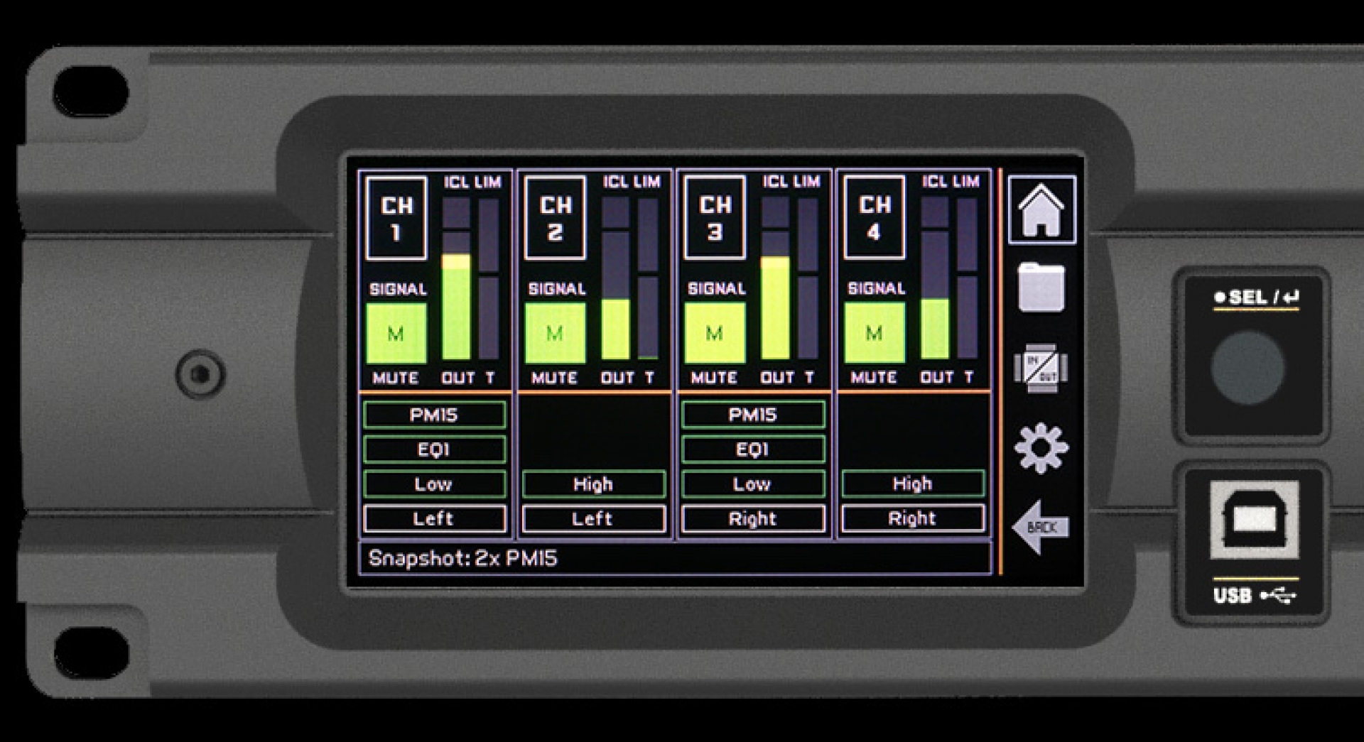Pi series has an extra-large 4.3″ IPS display with capacitive touch panel whereby it is possible to control and manage every parameter of the amp and select all System Presets, Uses, User EQ and Snapshots created.